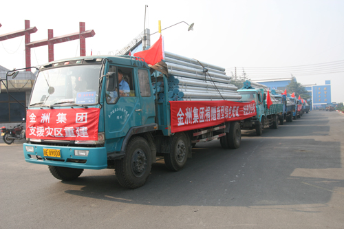 2008年“5.12”四川大地震期間,金洲集團(tuán)和全體員工共捐款捐物500余萬元,以送溫暖、獻(xiàn)愛心的行動支援災(zāi)區(qū)抗震救災(zāi)。其中:公司專門捐贈兩火車皮新型飲用水綠色管道——鋼塑復(fù)合管85噸,用于災(zāi)區(qū)盡快修復(fù)供飲水設(shè)施;公司干部職工紛紛解囊捐款126余萬元,黨員繳納特殊黨費(fèi)126850元。同時為積極響應(yīng)“汶川大救援,云南大行動”五大行動中之“七彩云南愛心大行動”,云南金孔雀旅游集團(tuán)公司主動承接四川省臥龍中國大熊貓研究中心的“美茜”、“思嘉”、“芊芊”三只大熊貓的代養(yǎng)工作,并還向四川臥龍?zhí)貏e行政區(qū)捐贈200萬元。