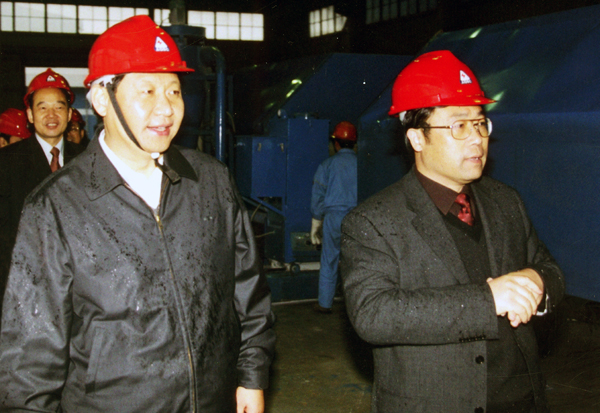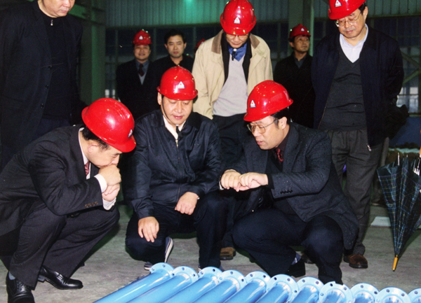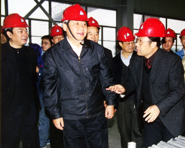 2002年12月,時任浙江省委書記的習近平同志視察金洲管道生產(chǎn)園區(qū),在金洲集團董事長俞錦方(右一)陪同下考察了鋼塑復合管、大口徑雙面涂敷鋼管生產(chǎn)線。