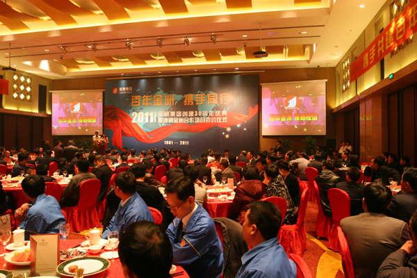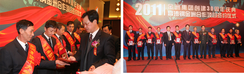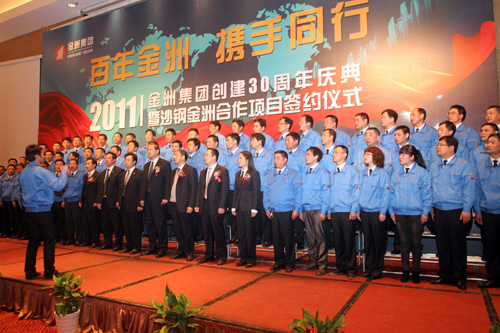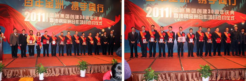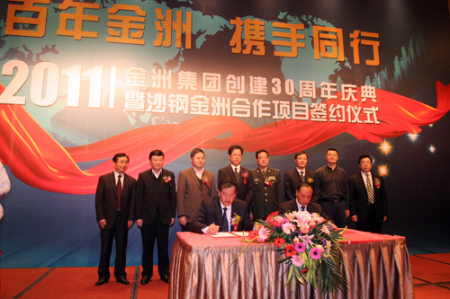2011年12月20日下午,金洲集團創(chuàng)建三十周年慶典暨沙鋼金洲合作項目簽約儀式在湖州雷迪森大酒店隆重舉行。湖州市委書記、市人大主任孫文友,陸軍第一集團軍參謀長陳道祥少將,副市長周杰,市政協(xié)副主席、工商聯(lián)主席曹德平和吳興區(qū)委書記施根寶、區(qū)長蔡旭昶等主要領(lǐng)導及老干部代表出席大會;中海油能源發(fā)展公司總經(jīng)理閆嗣伶,沙鋼集團總裁龔盛、投資部長錢正,金洲集團董事局領(lǐng)導、中海金洲和湄公河公司領(lǐng)導班子、50位先進人物及員工代表參加了慶典大會。