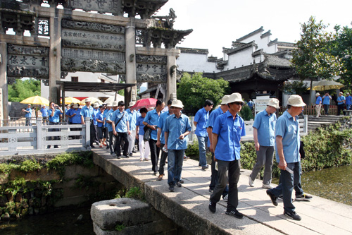 離開涇縣,公司黨員們又來到了績溪縣龍川村。在景區(qū)入口處,一面巨型黨旗讓紅色旋律響徹云霄,又正值當(dāng)?shù)卮迕裾谶M(jìn)行舞龍表演,充分感受到了和諧之源的文化魅力。龍川村由于特殊的地理環(huán)境和綿長的歷史文化淵源,形成了獨(dú)特的自然和人文景觀,有江南第一祠、木雕藝術(shù)博物館、民族藝術(shù)殿堂等——胡氏宗祠,又有“天工人可代,人工天不如”美譽(yù)的奕世尚書坊,山環(huán)水繞的秀麗風(fēng)景加上雕刻精湛、造型美觀的徽派建筑,使大家從徽州文化之中領(lǐng)悟了中華傳統(tǒng)文化的博大精深、千古靈氣。