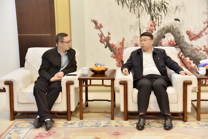 俞錦方董事長向新到任的沈明亮主任介紹企業(yè)相關(guān)情況